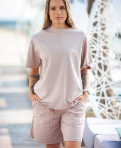 Тип: Жіночий костюм Сезон: Літо 2025 Матеріал: 95% бавовна, 5% еластан Колір: Бежевий Вид товару: Костюм Стиль: Оверсайз